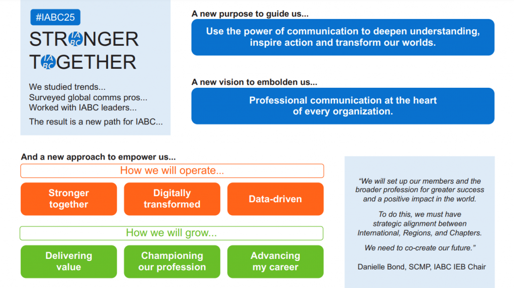 Just as the world is changing, IABC must also evolve. We are currently focusing on our Stronger Together #IABC2025 Strategic Plan through 2025 as our response to the changes impacting our world and our profession. Learn more about this Strategic Plan and the steps were taking to improve IABC today: